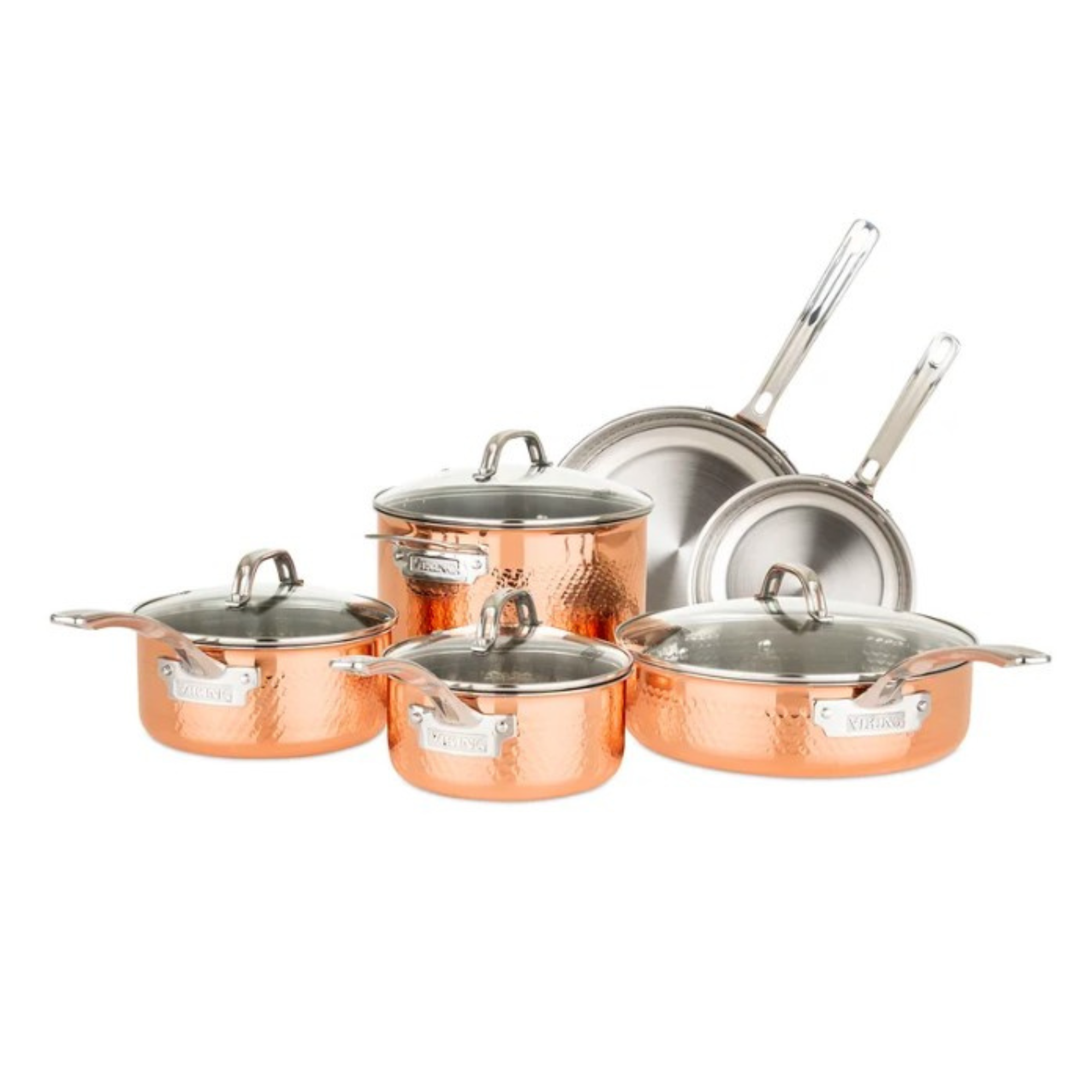 The 10-piece set is described as a treasured possession for both professional chefs and home cooks. It meets high standards while presenting a pleasing appearance, especially when displayed above an island or next to a stainless steel kitchen appliance.