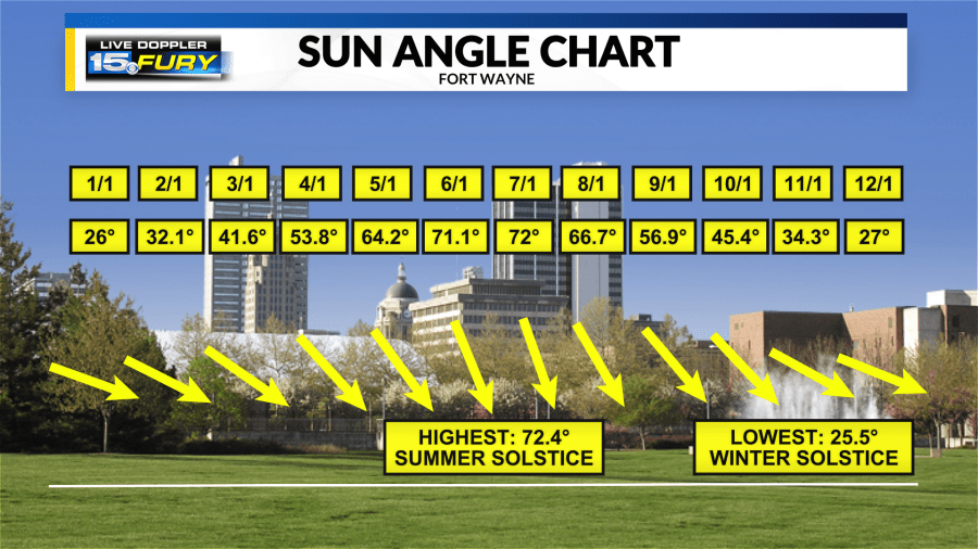 Here is a table illustrating the variation in solar angles throughout the year for this region. Each entry marks the beginning of every month along with the respective peak sun angle observed during these times. It's evident that the position of the sun changes significantly across months, making seasonal transitions particularly distinct in northeastern Indiana and northwestern Ohio. We experience our most elevated sun angle approximately at the time of the summer solstice in late June when it reaches up to 72.4° in Fort Wayne. Following this point, the angle gradually diminishes down to about 25.5° around the winter solstice in late December. Afterward, the pattern repeats itself as the sun angle climbs back once more toward another summer solstice.