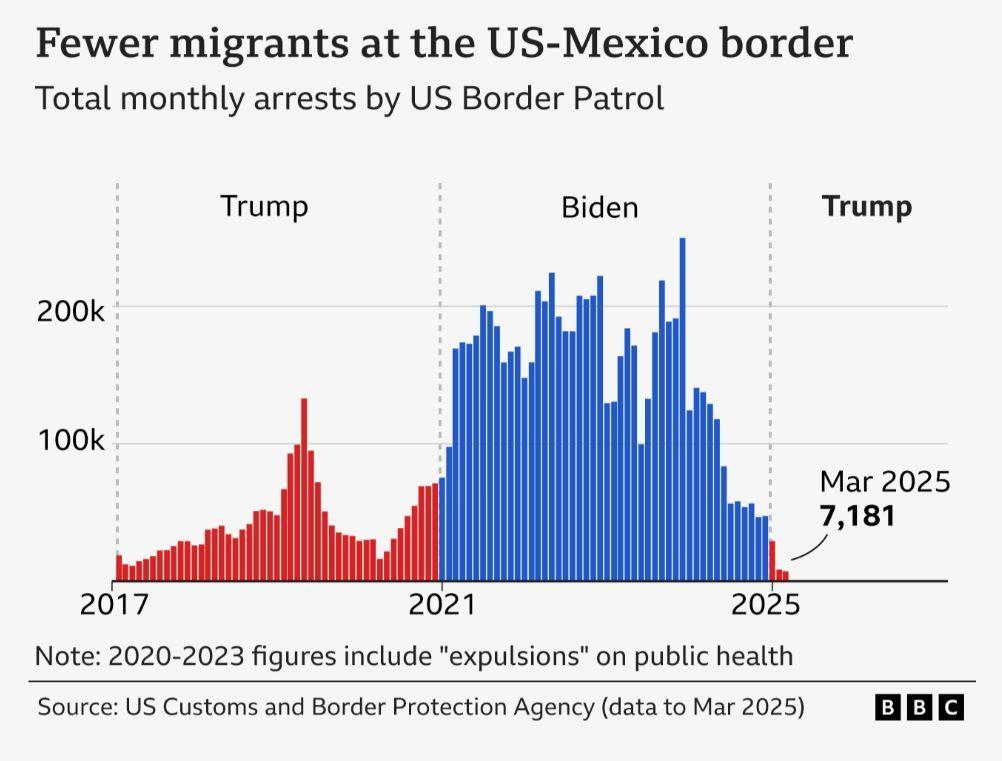 Trump has caused a significant decrease in the number of illegal immigrants entering the U.S., yet his administration faces political risk due to the ongoing global trade conflict.